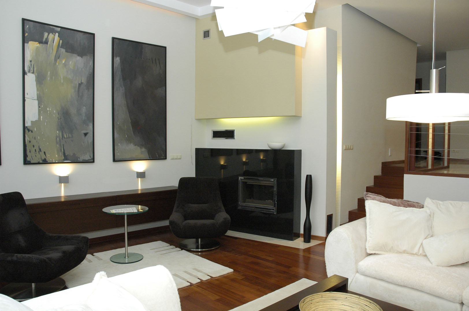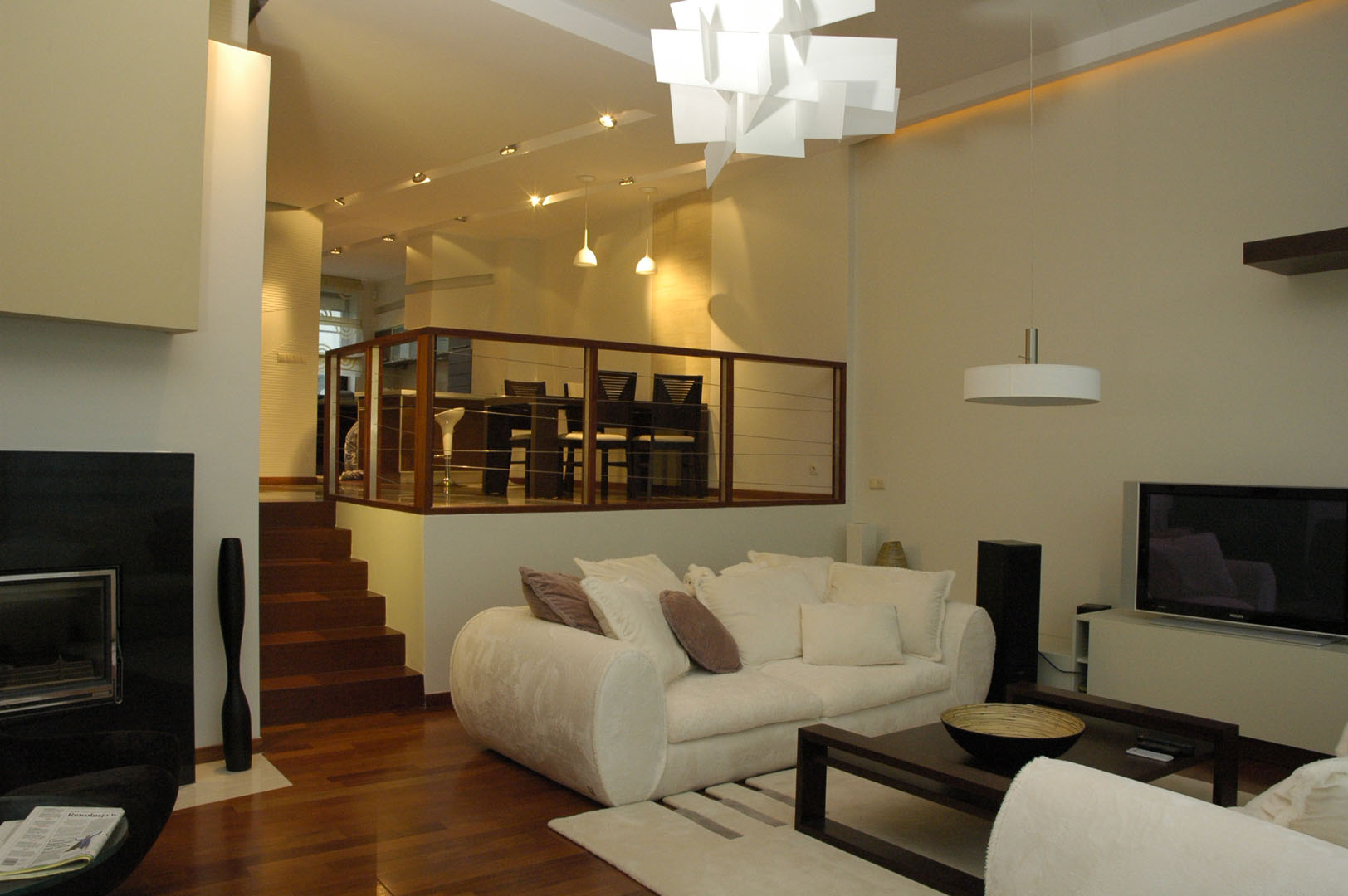 04 sofy stolik kawowy lampy stół z krzesłami schody