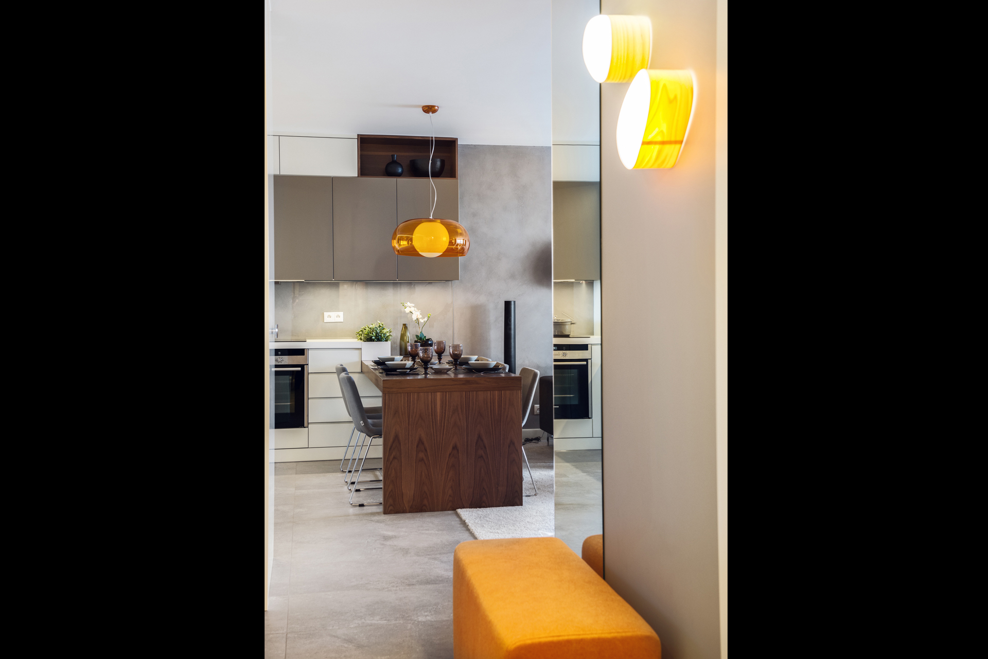 01 stolik sofa pomarańczowa lampa stalowe drzwi