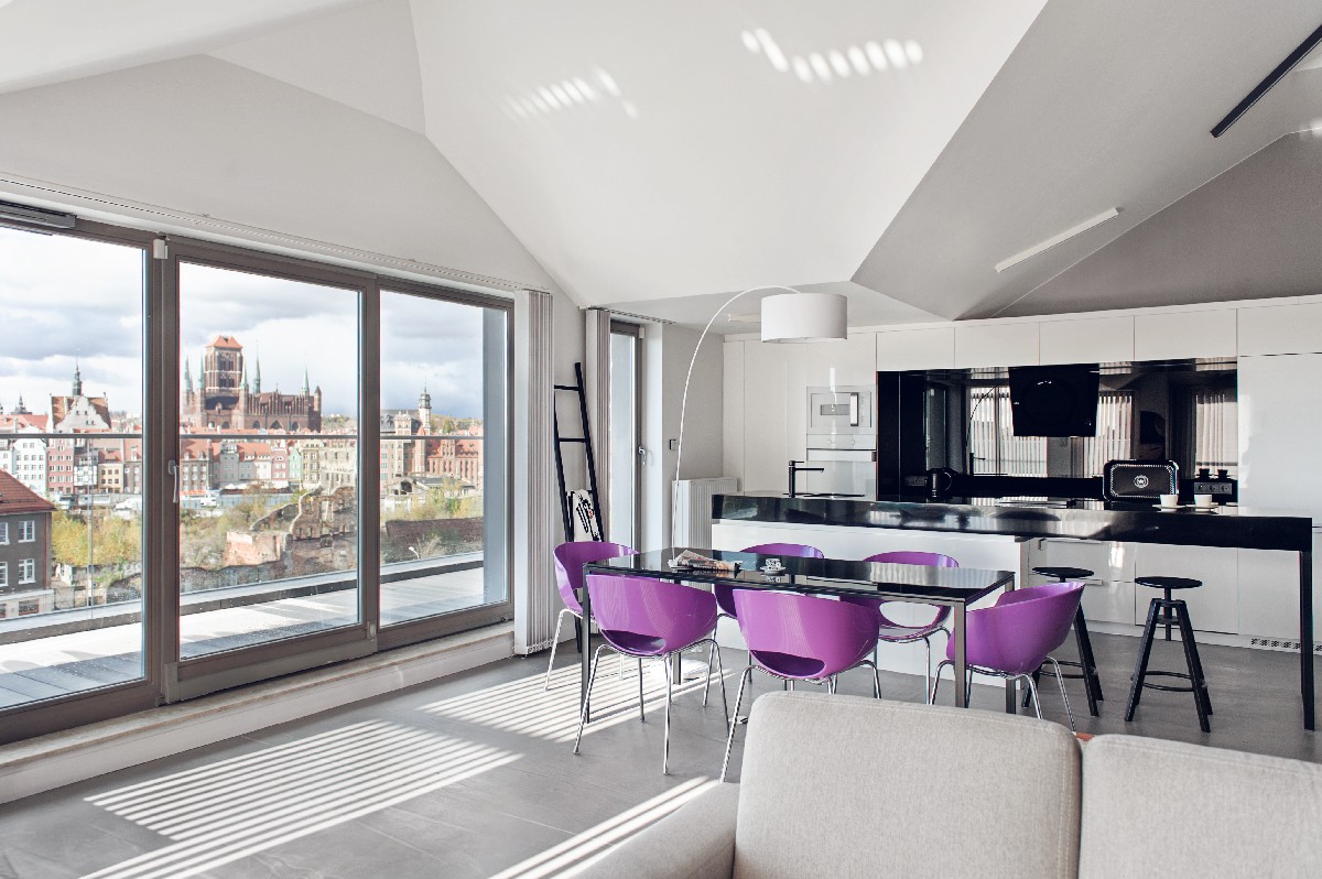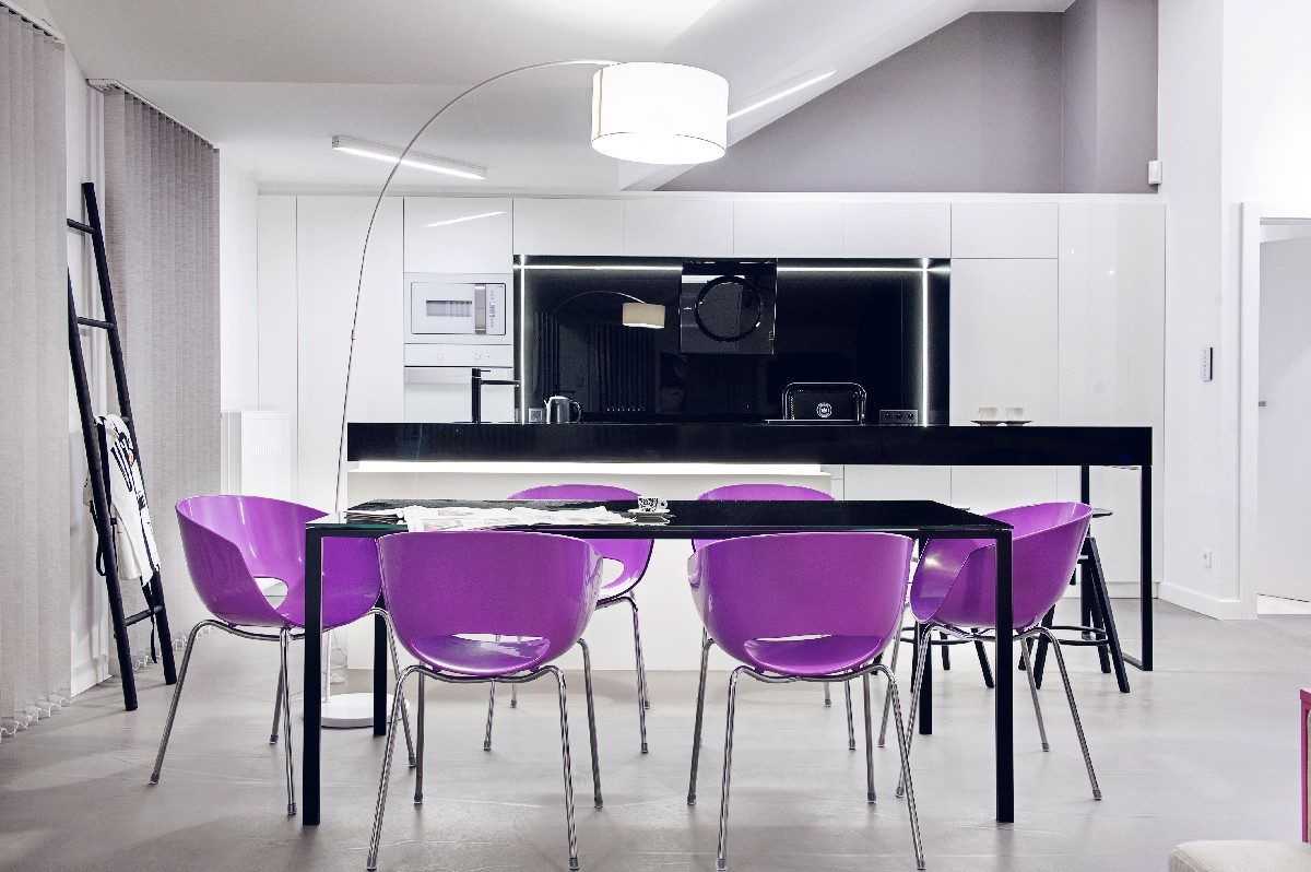 02 różowe krzesła czarny stół lampa drabina kuchnia
