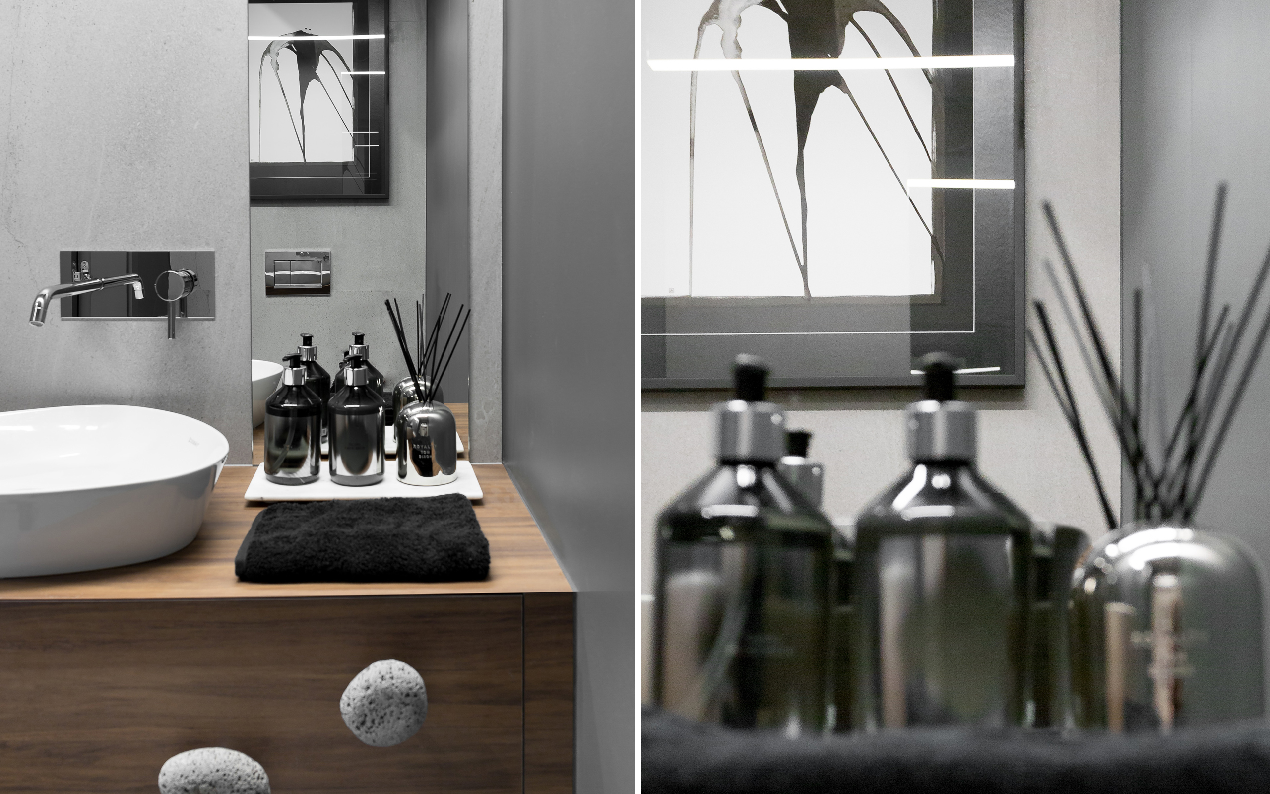 07 sedes wiszący umywalka ciemne płytki szklane półki