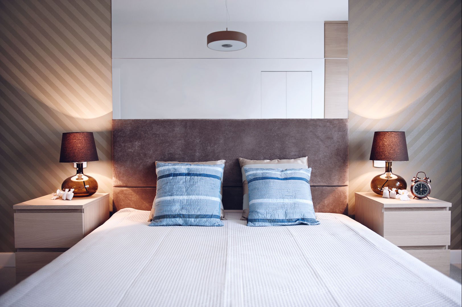 19 łóżko tapicerowane wezgłowie lampki nocne tapeta lustro